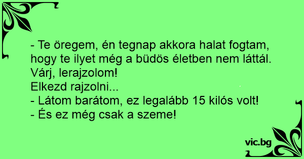 - Te öregem, én tegnap akkora halat fogtam, hogy te ilyet még a büdös életben nem láttál. Várj, lerajzolom!
