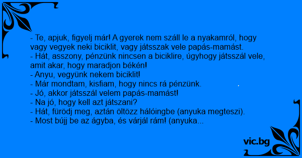 - Te, apjuk, figyelj már! A gyerek nem száll le a nyakamról, hogy vagy vegyek neki biciklit, vagy játsszak vele papás-mamást.