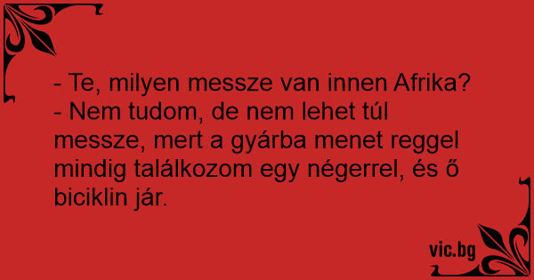 A kisfiú kérdezi az apukáját: - Apu, messze van tőlünk Afrika Mire az apuka: - Hát kisfiam nem hiszem, hogy messze van, mert nálunk dolgozik egy néger csávó oszt az biciklivel jár dolgozni.