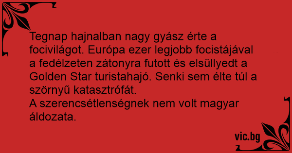 Tegnap hajnalban nagy gyász érte a focivilágot. Európa ezer legjobb focistájával a fedélzeten zátonyra futott és elsüllyedt a Golden Star turistahajó. Senki sem élte túl a szörnyű katasztrófát.