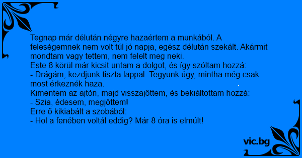 Tegnap már délután négyre hazaértem a munkából. A feleségemnek nem volt túl jó napja, egész délután szekált. Akármit mondtam vagy tettem, nem felelt meg neki. Este 8 körül már kicsit untam a dolgot, és így szóltam hozzá: - Drágám, kezdjünk tiszta lappal. Tegyünk úgy, mintha még csak most érkeznék haza. Kimentem az ajtón, majd visszajöttem, és bekiáltottam hozzá: - Szia, édesem, megjöttem! Erre ő kikiabált a szobából: - Hol a fenében voltál eddig? Már 8 óra is elmúlt!