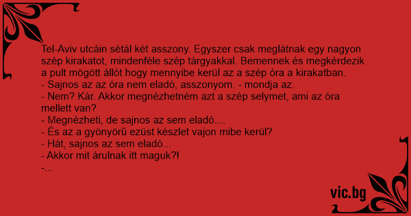 Tel-Aviv utcáin sétál két asszony. Egyszer csak meglátnak egy nagyon szép kirakatot, mindenféle szép tárgyakkal. Bemennek és megkérdezik a pult mögött állót hogy mennyibe kerül az a szép óra a kirakatban.
