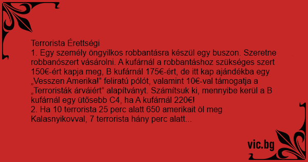 Terrorista Érettségi 1. Egy személy öngyilkos robbantásra készül egy buszon. Szeretne robbanószert vásárolni. A kufárnál a robbantáshoz szükséges szert 150€-ért kapja meg, B kufárnál 175€-ért, de itt kap ajándékba egy „Vesszen Amerika!” feliratú pólót, valamint 10€-val támogatja a „Terroristák árváiért” alapítványt. Számítsuk ki, mennyibe kerül a B kufárnál egy ütősebb C4, ha A kufárnál 220€! 2. Ha 10 terrorista 25 perc alatt 650 amerikait öl meg Kalasnyikovval, 7 terrorista hány perc alatt öl meg 485 angol utászt páncélököllel? 3. Van egy olasz újságíró túsz, akit 2 napja ejtettünk. A követelésünk az, hogy hagyják el az országot az olasz rendfenntartók, illetve engedjék el terrorista vezérünket. Mennyi az esély arra, hogy mindezt kapjuk, ha feltesszük Internetre, ahogy a férfi kezét levágjuk? 4. Ha 12 öngyilkos merőnylő 21perc alatt, 122 AK-s 17 perc alatt és 32 páncélöklös 31 perc alatt foglal el egy amerikai támaszpontot, hány perc alatt foglalják el együttesen?