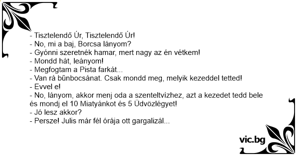 - No, lányom, akkor menj oda a szenteltvízhez, azt a kezedet tedd bele és mondj el 10 Miatyánkot és 5 Üdvözlégyet!