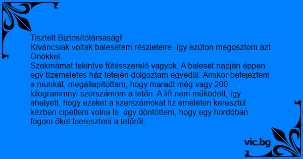 Szakmámat tekintve fűtésszerelő vagyok. A baleset napján éppen egy tízemeletes ház tetején dolgoztam egyedül. Amikor befejeztem a munkát, megállapítottam, hogy maradt még vagy 200 kilogrammnyi szerszámom a tetőn. A lift nem működött, így ahelyett, hogy ezeket a szerszámokat tiz emeleten keresztül kézben cipeltem volna le, úgy döntöttem, hogy egy hordóban fogom őket leereszteni a tetőről, kötél és csiga segítségével. Miután a földszinten rögzítettem a kötelet, felmentem a tetőre és bepakoltam a szerszámokat a hordóba. Ezután lementem a fölszintre, kioldottam a kötelet, és jó erősen tartottam, hogy a 200 kilónyi szerszám lassú leereszkedését biztosítsam. A baleseti jelentés 11. szakaszában láthatják, hogy testsúlyom 60 kg. Elképzelhetik a meglepetésemet, amikor a 200 kilónyi szerszám súlya hirtelen felröppentett a levegőbe. Én lélekjelenlétemet elvesztve elfelejtettem elengedni a kötelet. Szükségtelen említenem, hogy meglehetősen ijesztő ütemben repültem felfelé az épület fala mentén, neki-neki ütődve annak oldalához. Az ötödik emelet magasságában találkoztam össze a lefelé zuhanó hordóval. Ez a magyarázata a repedt koponyámnak és a törött kulcscsontomnak. Csak kevéssé lassultam le, és így folytattam az egyre gyorsuló emelkedésemet és meg sem álltam addig, míg a jobb kezem ujjpercei öt centi mélyen bele nem fúródtak a csigába. Ez alkalommal szerencsére visszanyertem a lélekjelenlétemet és meg tudtam markolni a kötelet a fájdalom ellenére. Ezzel egyidőben a hordó nekicsapódott a földnek, aminek következtében letört az alja és a benne lévő szerszámok mind kiszóródtak. Így most már üres volt a hordó, így elkezdtem nagy sebességgel lefelé zuhanni az épület fala mentén. Az ötödik emelet közelében ismételten összetalálkoztam a hordóval, ami éppen felfelé tartott. Ez a magyarázata mindkét törött bokámnak és a hasadásoknak a lábszáraimon. Amikor nekicsapódtam a hordónak, eléggé lelassultam ahhoz, hogy csak három hátcsigolyám, két bordám törjön el, amikor a fölre érkezvén a szerszámokra estem. Sajnálattal jelentem, hogy amint ott feküdtem a földön nagy fájdalmak közepette, ismét elvesztettem a lélekjelenlétemet és elengedtem a kötelet. Ekkor a hordó hirtelen megindult egyenesen felém, egyre gyorsuló, szédítő sebességggel. A hordó leérkezvén, eltörte a medencecsontomat. Sajnálattal kell közölnöm, itt elvesztettem az eszméletemet, és többre nem emlékszem...