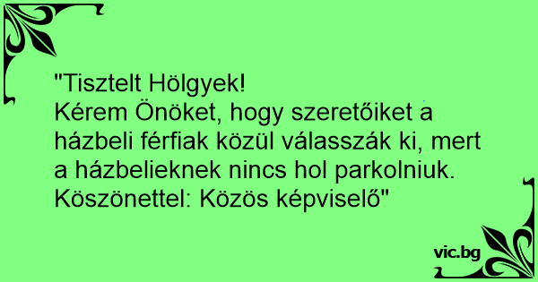 Kérem Önöket, hogy szeretőiket a házbeli férfiak közül válasszák ki, mert a házbelieknek nincs hol parkolniuk.