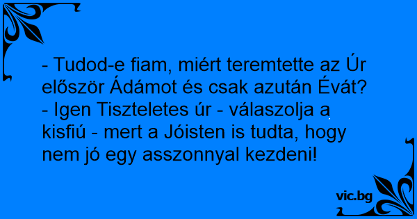 - Igen Tiszteletes úr - válaszolja a kisfiú - mert a Jóisten is tudta, hogy nem jó egy asszonnyal kezdeni!