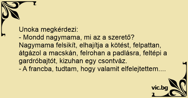 - Nagymama, mi az, hogy szerető? - Jaajj! -kiáltja a nagymama, majd eldobja a kötőtűket, a macskát és ezerrel felteper a padlásra. Feltépi a régi nagy szekrény ajtaját, melyből kiborul egy...