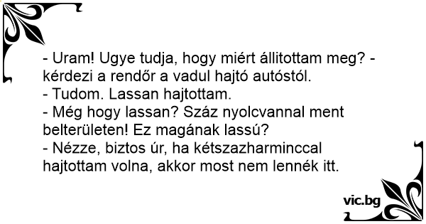 - Uram! Ugye tudja, hogy miért állitottam meg? - kérdezi a rendőr a vadul hajtó autóstól.