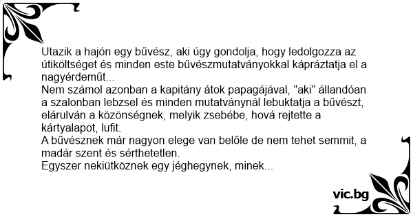 Egyszer nekiütköznek egy jéghegynek, minek következtében a hajó léket kap és elsüllyed. A bűvész valahogy megmenekül, egy ócska utazóládába kapaszkodva hánykolódik a hullámokon. Hirtelen szárnycsapkodást hall, majd leszáll a ládára a papagáj. Sokáig szótlanul bámulják egymást, a papagáj nézelődik, kémlel a bűvész háta mögé majd megtöri a csendet. Jól van basszus, te nyertél! Hová dugtad a hajót?