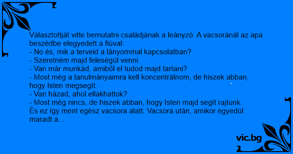 Választottját vitte bemutatni családjának a leányzó. A vacsoránál az apa beszédbe elegyedett a fiúval:
