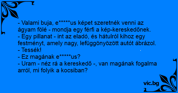 - Valami buja, e*****us képet szeretnék venni az ágyam fölé - mondja egy férfi a kép-kereskedőnek.