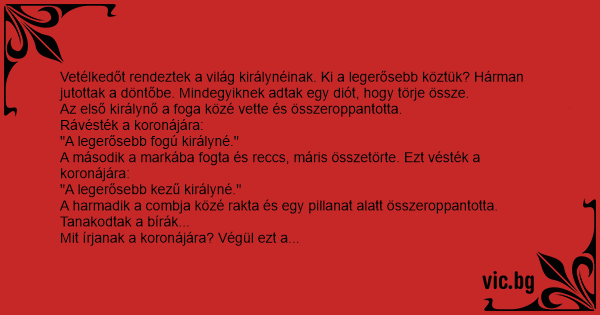 Vetélkedőt rendeztek a világ királynéinak. Ki a legerősebb köztük? Hárman jutottak a döntőbe. Mindegyiknek adtak egy diót, hogy törje össze.