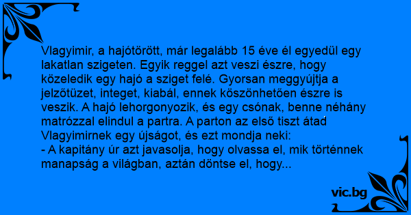 Vlagyimir, a hajótörött, már legalább 15 éve él egyedül egy lakatlan szigeten. Egyik reggel azt veszi észre, hogy közeledik egy hajó a sziget felé. Gyorsan meggyújtja a jelzőtüzet, integet, kiabál, ennek köszönhetően észre is veszik. A hajó lehorgonyozik, és egy csónak, benne néhány matrózzal elindul a partra. A parton az első tiszt átad Vlagyimirnek egy újságot, és ezt mondja neki: