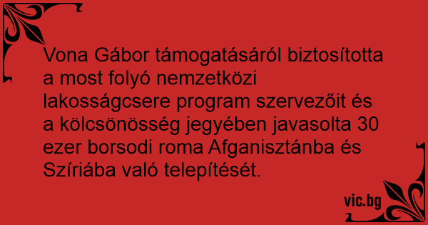 Vona Gábor támogatásáról biztosította a most folyó nemzetközi lakosságcsere program szervezőit és a kölcsönösség jegyében javasolta 30 ezer borsodi roma Afganisztánba és Szíriába való telepítését.