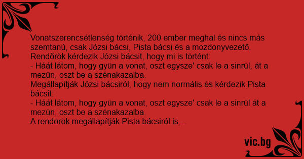 - Háát látom, hogy gyün a vonat, oszt egysze' csak le a sinrül át a mezün, oszt be a szénakazalba.