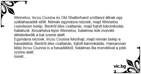 Egymásra néznek, Incsu Csunna felsóhajt, majd némán belép a hasadékba. Bentről éles csattanás, fojtott káromkádás. Hamarosan kilép Incsu Csunna is a hasadékból, hatalmas lila monoklival a jobb szeme alatt.