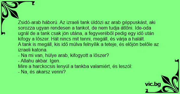 Zsidó-arab háború. Az izraeli tank üldözi az arab géppuskást, aki sorozza ugyan rendesen a tankot, de nem tudja átlőni. Ide-oda ugrál de a tank csak jön utána, a fegyveréből pedig egy idő után kifogy a lőszer. Hát nincs mit tenni, megáll, és várja a halált.