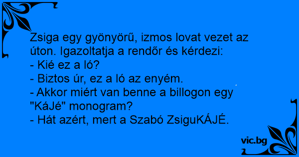 Zsiga egy gyönyörű, izmos lovat vezet az úton. Igazoltatja a rendőr és kérdezi: