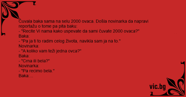 Баба во село чувала 200 овци и дошла некоја новинарка да и направи интервју: Кажи ни бабо како успевате да ги чувате сите 200 овци? Бабата: - Па, јас ќерко целиот мој живот го правам тоа, се...