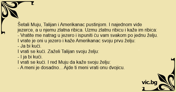 Šetali Muju, Talijan i Amerikanac pustinjom. I najednom vide jezerce, a u njemu zlatna ribica. Uzmu zlatnu ribicu i kaže im ribica: