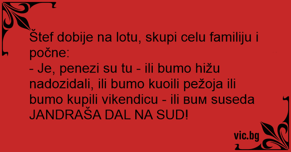 - Je, penezi su tu - ili bumo hižu nadozidali, ili bumo kuoili pežoja ili bumo kupili vikendicu - ili вuм suseda JANDRAŠA DAL NA SUD!