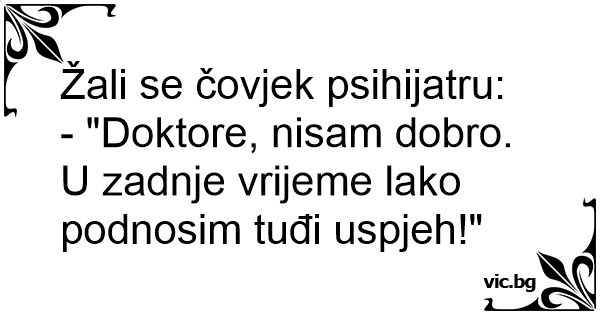 - "Doktore, nisam dobro. U zadnje vrijeme lako podnosim tuđi uspjeh!"
