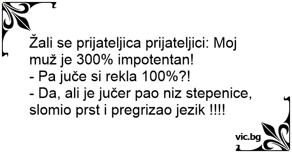 Žali se prijateljica prijateljici: Moj muž je 300% impotentan!