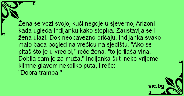 Žena se vozi svojoj kući negdje u sjevernoj Arizoni kada ugleda Indijanku kako stopira. Zaustavlja se i žena ulazi. Dok neobavezno pričaju, Indijanka svako malo baca pogled na vrećicu na sjedištu. "Ako se pitaš što je u vrećici," reče žena, "to je flaša vina. Dobila sam je za muža." Indijanka šuti neko vrijeme, klimne glavom nekoliko рuта, i reče: