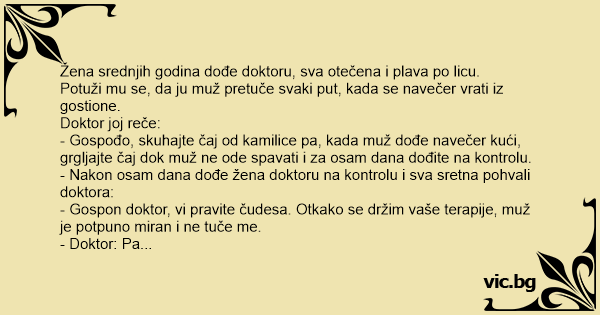 - Gospođo, skuhajte čaj od kamilice pa, kada muž dođe navečer kući, grgljajte čaj dok muž ne ode spavati i za osam dana dođite na kontrolu.