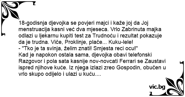 18 годишно италианско момиче казало на майка си, че вече 2 месеца няма цикъл. Много притеснена майката отишла до близката дрогерия и купила тест за бременност. Резултата показал, че девойката е бременна. Псувайки и плачейки майката попитала: 'Коя е...
