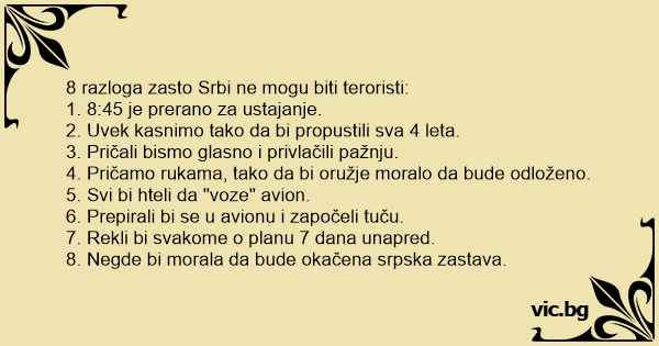8 razloga zasto Srbi ne mogu biti teroristi: 1. 8:45 je prerano za ustajanje. 2. Uvek kasnimo tako da bi propustili sva 4 leta. 3. Pričali bismo glasno i privlačili pažnju. 4. Pričamo rukama, tako da bi oružje moralo da bude odloženo. 5. Svi bi hteli da "voze" avion. 6. Prepirali bi se u avionu i započeli tuču. 7. Rekli bi svakome o planu 7 dana unapred. 8. Negde bi morala da bude okačena srpska zastava.