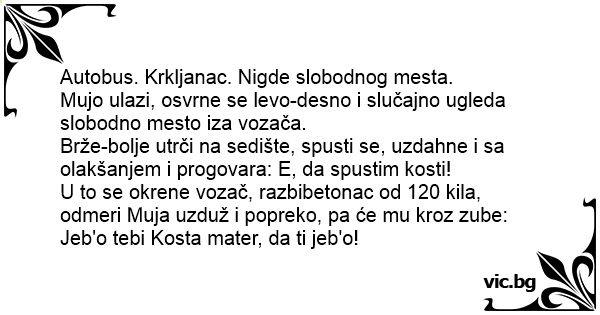 U to se okrene vozač, razbibetonac od 120 kila, odmeri Muja uzduž i popreko, pa će mu kroz zube: Jeb'o tebi Kosta mater, da ti jeb'o!