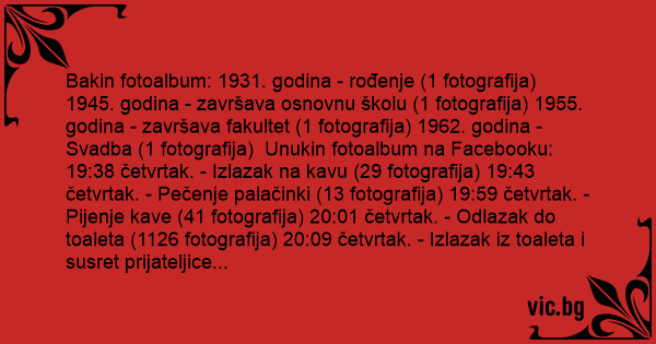 Bakin fotoalbum: 1931. godina - rođenje (1 fotografija) 1945. godina - završava osnovnu školu (1 fotografija) 1955. godina - završava fakultet (1 fotografija) 1962. godina - Svadba (1 fotografija) Unukin fotoalbum na Facebooku: 19:38 četvrtak. - Izlazak na kavu (29 fotografija) 19:43 četvrtak. - Pečenje palačinki (13 fotografija) 19:59 četvrtak. - Pijenje kave (41 fotografija) 20:01 četvrtak. - Odlazak do toaleta (1126 fotografija) 20:09 četvrtak. - Izlazak iz toaleta i susret prijateljice (56GB fotografija)