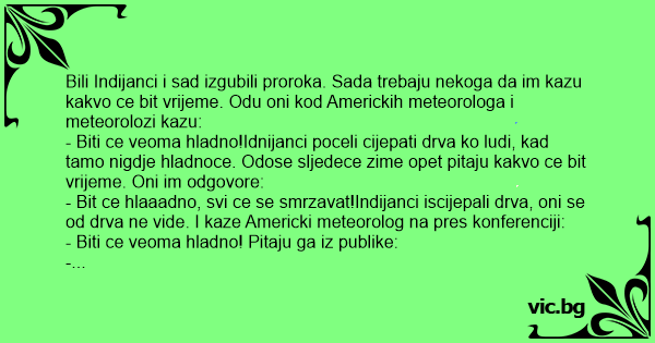 Bili Indijanci i sad izgubili proroka. Sada trebaju nekoga da im kazu kakvo ce bit vrijeme. Odu oni kod Americkih meteorologa i meteorolozi kazu: