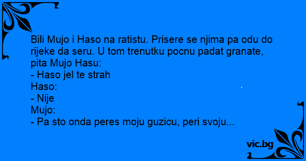 Bili Mujo i Haso na ratistu. Prisere se njima pa odu do rijeke da seru. U tom trenutku pocnu padat granate, pita Mujo Hasu: