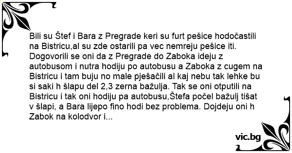 Bili su Štef i Bara z Pregrade keri su furt pešice hodočastili na Bistricu,al su zde ostarili pa vec nemreju pešice iti. Dogovorili se oni da z Pregrade do Zaboka ideju z autobusom i nutra hodiju po autobusu a Zaboka z cugem na Bistricu i tam buju no male pješačili al kaj nebu tak lehke bu si saki h šlapu del 2,3 zerna bažulja. Tak se oni otputili na Bistricu i tak oni hodiju pa autobusu,Štefa počel bažulj tišat v šlapi, a Bara lijepo fino hodi bez problema. Dojdeju oni h Zabok na kolodvor i pita Štef Baru:
