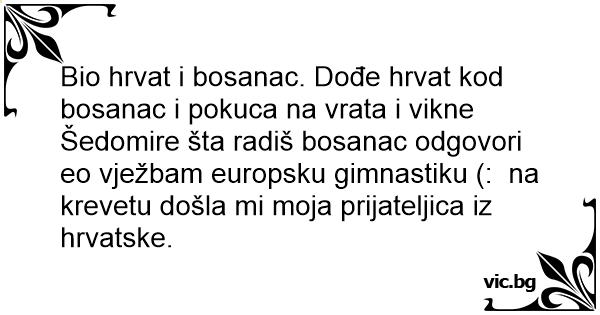Bio hrvat i bosanac. Dođe hrvat kod bosanac i pokuca na vrata i vikne Šedomire šta radiš bosanac odgovori eo vježbam europsku gimnastiku (: na krevetu došla mi moja prijateljica iz hrvatske.