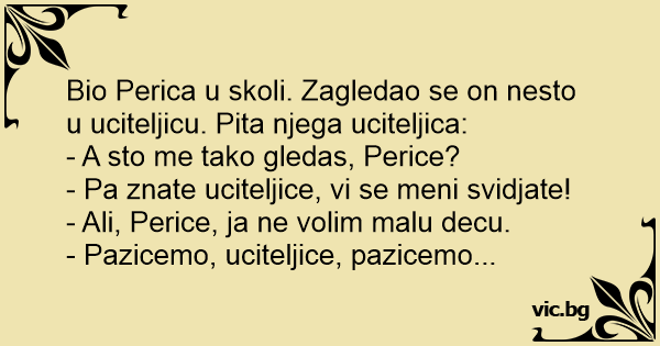 Bio Perica u skoli. Zagledao se on nesto u uciteljicu. Pita njega uciteljica: