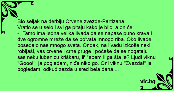 - "Tamo ima jedna velika livada da se napase puno krava i dve ogromne mreže da se po'vata mnogo riba. Oko livade posedalo nas mnogo sveta. Ondak, na livadu izićoše neki robijaši, vas crvene i crne pruge i počeše da se nogataju sas neku lubenicu kriškaru, il' *ebem li ga šta je? Ljudi viknu "Gooo!", ja pogledam, niđe niko go. Oni viknu "Zvezda!" ja pogledam, odkud zezda u sred bela dana. Viknu "Partizan!", a ja pobegnem, jer mi deda bio četnik!
