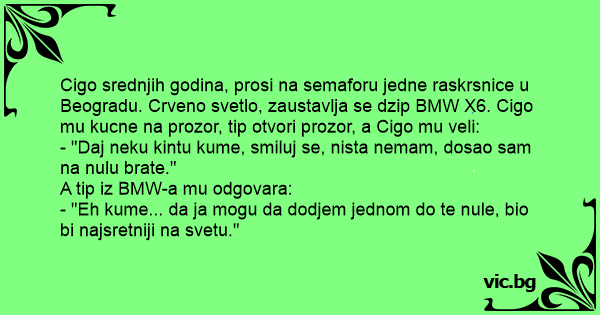 Cigo srednjih godina, prosi na semaforu jedne raskrsnice u Beogradu. Crveno svetlo, zaustavlja se dzip BMW X6. Cigo mu kucne na prozor, tip otvori prozor, a Cigo mu veli: