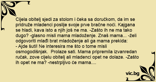 Cijela obitelj sjedi za stolom i čeka sa doručkom, da im se pridruže mladenci poslije svoje prve bračne noći. Kajgana se hladi, kava isto a njih još ne ma. -Zašto ih ne ma tako dugo? -glasno misli mama mladoženje. Znaš mama... -želi odgovoriti mlađi brat mladoženje ali ga mama prekida: