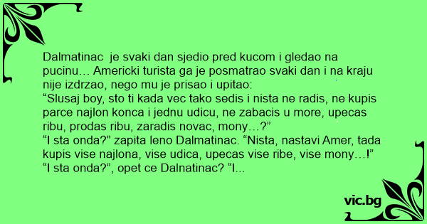 “I sta onda?” zapita leno Dalmatinac. “Nista, nastavi Amer, tada kupis vise najlona, vise udica, upecas vise ribe, vise mony…!”