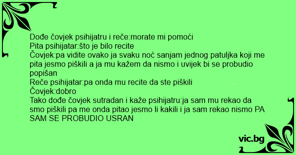 Tako dođe čovjek sutradan i kaže psihijatru:ja sam mu rekao da smo piškili pa me onda pitao jesmo li kakili i ja sam rekao nismo PA SAM SE PROBUDIO USRAN