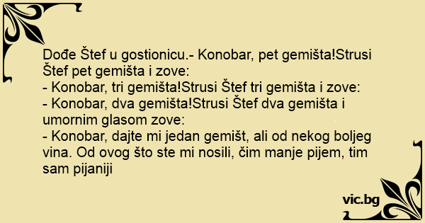Dođe Štef u gostionicu.- Konobar, pet gemišta!Strusi Štef pet gemišta i zove: