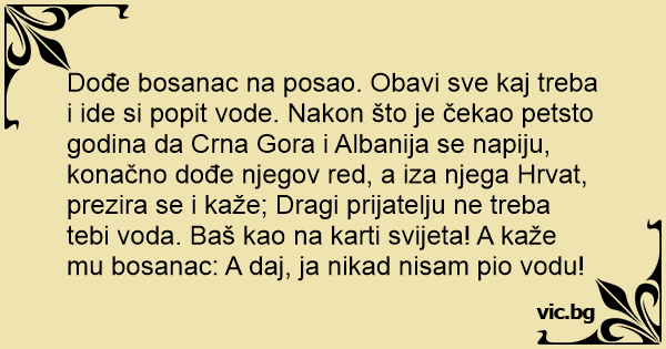 Dođe bosanac na posao. Obavi sve kaj treba i ide si popit vode. Nakon što je čekao petsto godina da Crna Gora i Albanija se napiju, konačno dođe njegov red, a iza njega Hrvat, prezira se i kaže; Dragi prijatelju ne treba tebi voda. Baš kao na karti svijeta! A kaže mu bosanac: A daj, ja nikad nisam pio vodu!