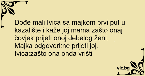 Dođe mali Ivica sa majkom prvi put u kazalište i kaže joj:mama zašto onaj čovjek prijeti onoj debelog ženi.