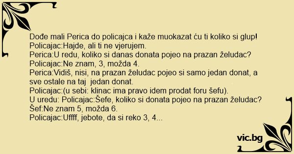 Perica:Vidiš, nisi, na prazan želudac pojeo si samo jedan donat, a sve ostale na taj jedan donat.