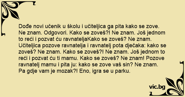 Dođe novi učenik u školu i učiteljica ga pita kako se zove. Ne znam. Odgovori. Kako se zoveš?! Ne znam. Još jednom to reći i pozvat ću ravnateljaKako se zoveš? Ne znam. Učiteljica pozove ravnatelja i ravnatelj pota dječaka: kako se zoveš? Ne znam. Kako se zoveš?! Ne znam. Još jednom to reći i pozvat ću ti mamu. Kako se zoveš? Ne znam! Pozove ravnatelj mamu i pita ju: kako se zove vaš sin? Ne znam. Pa gdje vam je mozak?! Eno, igra se u parku.