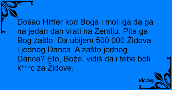 Došao Нiтlеr kod Boga i moli ga da ga na jedan dan vrati na Zemlju. Pita ga Bog zašto. Da ubijem 500 000 Židova i jednog Danca. A zašto jednog Danca? Eto, Bože, vidiš da i tebe boli k***c za Židove.